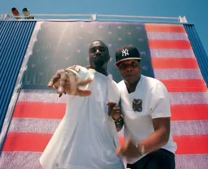 And finally the genre conventions of this video would be things such as the expensive car that is being driven around, the jewellery that they are wearing which shows they are wealthy and blinged out. Things such as the girls that are driving round in the swag car are examples of voyeurism, because they are all wearing clothing that shows off their body's and and good looking women who are clearly there because they are attracted to Kanye and Jay-z and they look like they're having fun; smiling and laughing, which also builds up the persona of their star image. As well as this Jay-z and Kanye are just chilling at a industrial area with a giant american flag behind them, showing they are proud to be american and that they have nothing to worry about. Being in a place where you can do what you want suggests riches and wealth.